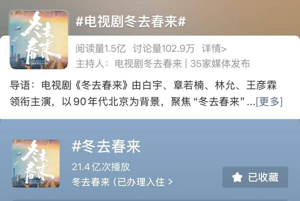 全网话题热度持续走高,微博主话题#电视剧冬去春来#阅读量超1.5亿,抖音主话题#冬去春来#播放量超20亿次,#接冬去春来迎梦想成真# #冬去春来相聚90年代# #冬去春来运镜# #白宇演技# #章若楠无言以表好好演戏# #冬去春来庄庄掀桌好爽#等700+热搜刷榜各大平台榜单,成为2026年开年最受关注的现实主义剧集。